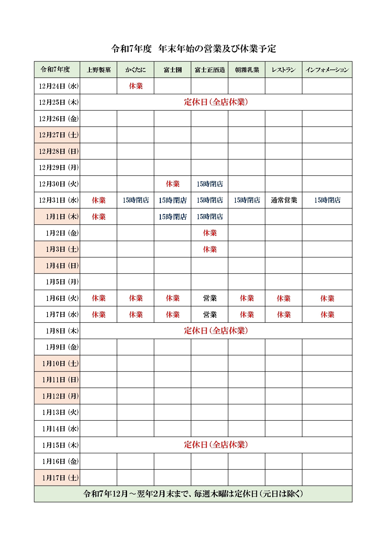 令和7年12月1日~令和8年2月28日の冬季営業時間は下記の通り変更となります。